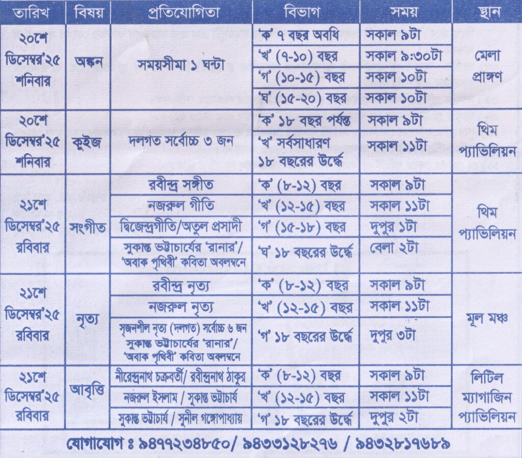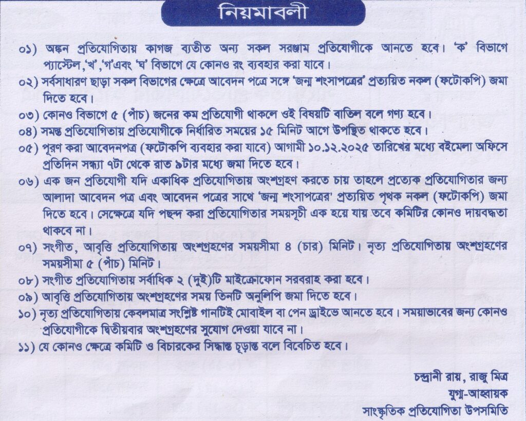 ২৯ তম কল্যাণী বই মেলার সাংস্কৃতিক প্রতিযোগিতার ফর্ম ফিলাপ শুরু হয়েছে। অনলাইন ফর্ম ও বিস্তারিত জানতে ক্লিক করুন