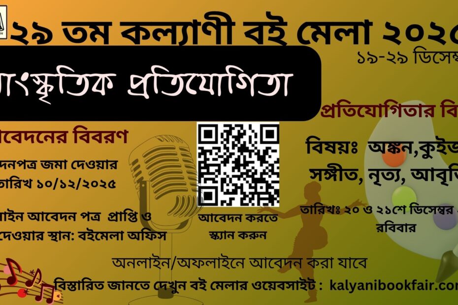 ২৯ তম কল্যাণী বই মেলার সাংস্কৃতিক প্রতিযোগিতার ফর্ম ফিলাপ শুরু হয়েছে। অনলাইন ফর্ম ও বিস্তারিত জানুন এই পোস্টে। অনলাইন ফর্ম – এর লিঙ্কঃ https://forms.gle/v9rBiAho9a8wBmiL6